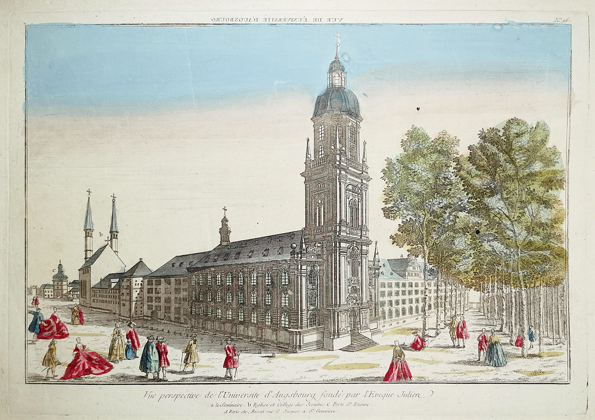 C18th engraving of Augsburg University, Germany. During the C18th vue d’optiques became extremely popular in England and Europe. They capitalised on a market eager for the latest novelty. They were specifically designed to create the illusion of perspective when viewed with a … Read Full Description