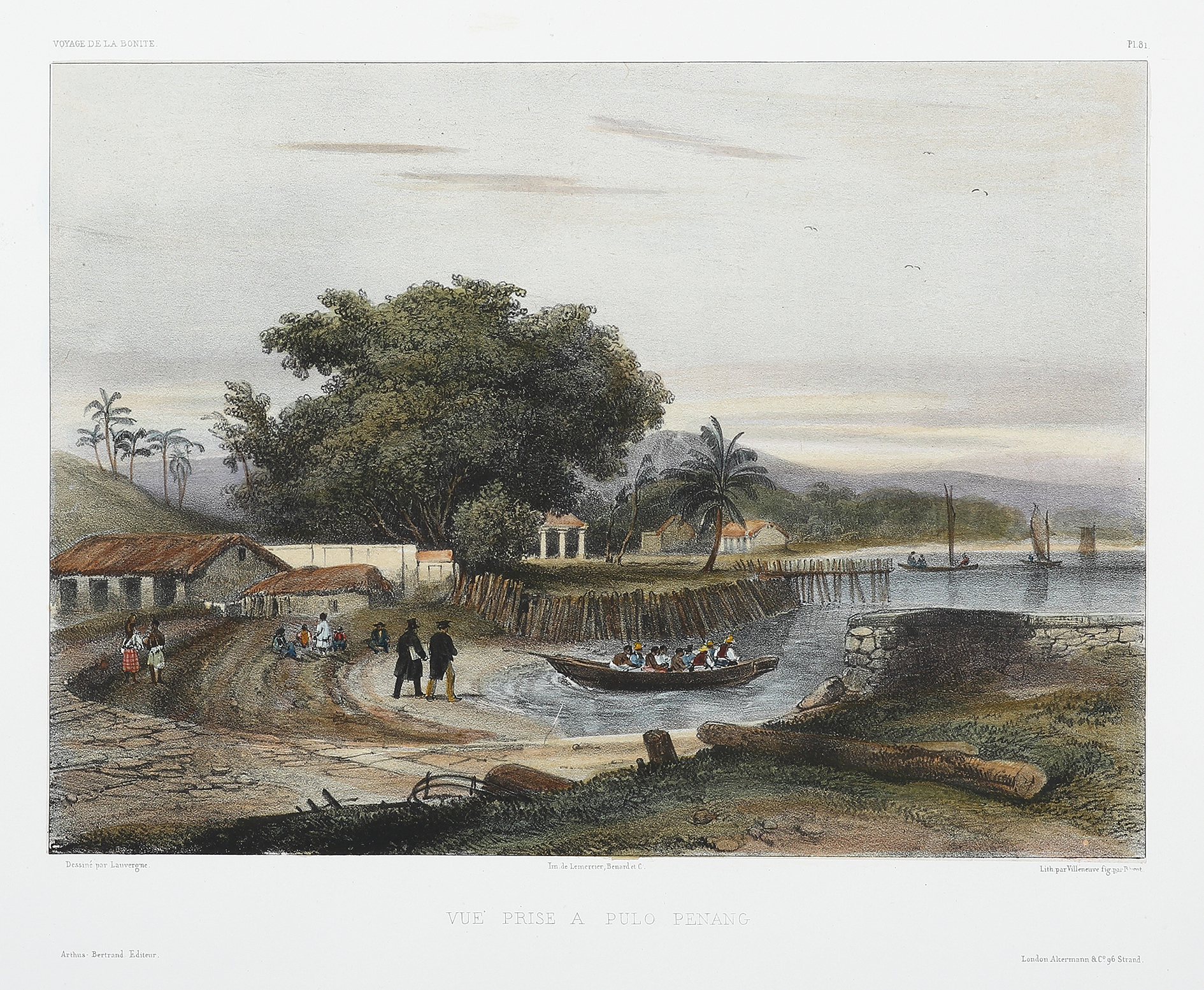 Rare c.19th aquatint of Penang by Barthelemy Lauvergne (1804 – 1871), from the official accounts of the voyage of the French corvette La Bonite, under the command of A.N. Vaillant.