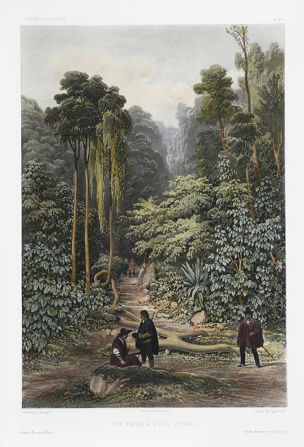 Rare c.19th aquatint of Penang by Barthelemy Lauvergne (1804 – 1871), from the official accounts of the voyage of the French corvette La Bonite, under the command of A.N. Vaillant.