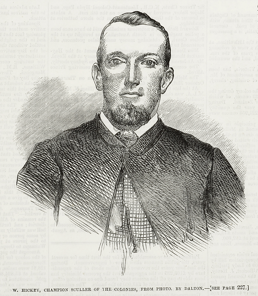 Rare engraving of the champion Australian sculler William Hickey who defeated Dick Green. Green had returned to Sydney to find a new champion in the person of W. Hickey, and after rowing several races against him, it was clearly demonstrated … Read Full Description