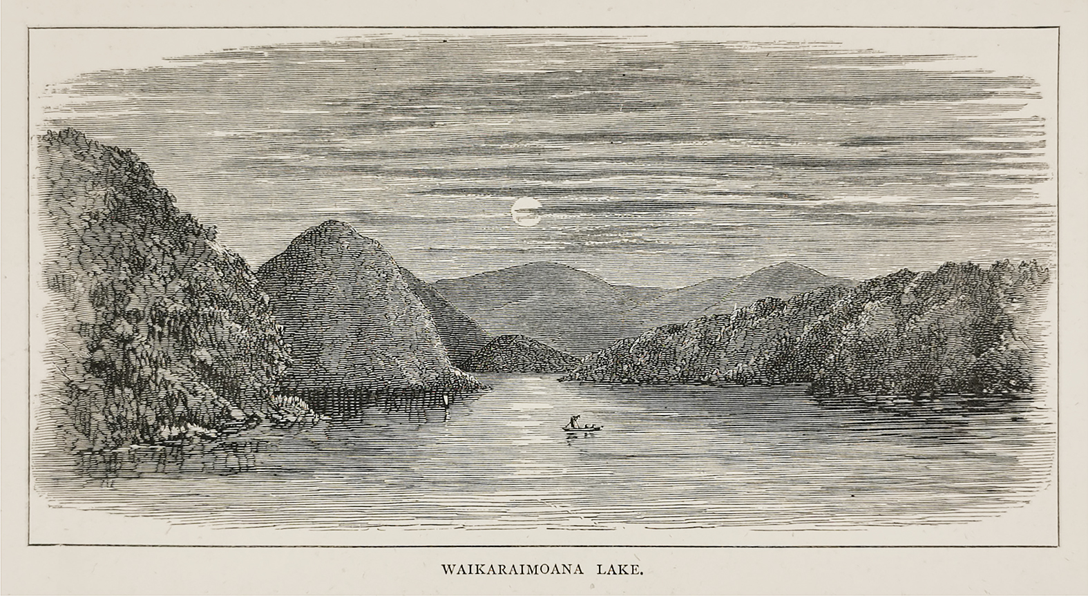Colonial engraving of Lake Waikaremoana, Te Urewera, North Island, New Zealand,