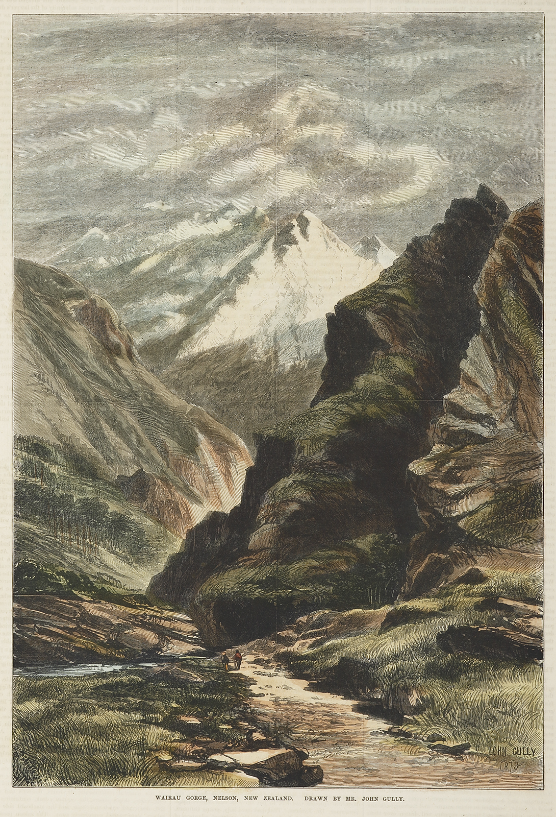 Gully was a New Zealand painter born in Bath. He was largely self-taught. Gully emigrated to New Zealand with his wife and three children in 1852. Gully originally settled on a small block of land in Omata, Taranaki, working in various jobs including farming and clerical work. During this time he advertised as a painter of ‘views’ of properties to send back to England. He eventually ended up bankrupt and so took some art pupils. In 1860 driven out by the land wars of Taranaki Gully moved with his family to Nelson. He was appointed part-time art master at Nelson College, though because he was self-taught and not schooled in the classical style, he was not popular with the principal. In 1863 Gully got a full-time job, with the assistance of his friend, politician and amateur painter James Crowe Richmond, as a draughtsman at the Department of Lands and Survey. Gully and Richmond painted landscapes together at Milford Sound, Lake Manapouri, and other locations. In the same year he successfully applied to illustrate a paper that was to be presented to the Royal Geographical Society by the famous explorer and geologist Julius von Haast. Haast had reservations about Gully’s skill, but both the paper and Gully’s twelve illustrations of lakes, mountains and glaciers in the South Island were a great success and established Gully’s reputation. In 1871 a work of Gully’s, Mount Cook and the Southern Alps, West Coast of New Zealand, was included in the British Royal Academy’s summer exhibition. Gully saw acceptance by this group as the high point of his career. This was a considerable achievement for a self-taught artist from the colonies. Gully had thought that success in England would confirm his ability and was particularly anxious to sell his work on the English market. ‘I shall no doubt find out whether I can paint or not, for [England’s] the place to take it out of a fellow if he has any conceit’. In 1878 Gully retired from his job as a draughtsman and turned to painting full-time. He continued to paint and exhibit, his last big exhibition being the Wellington Industrial Exhibition in 1885.