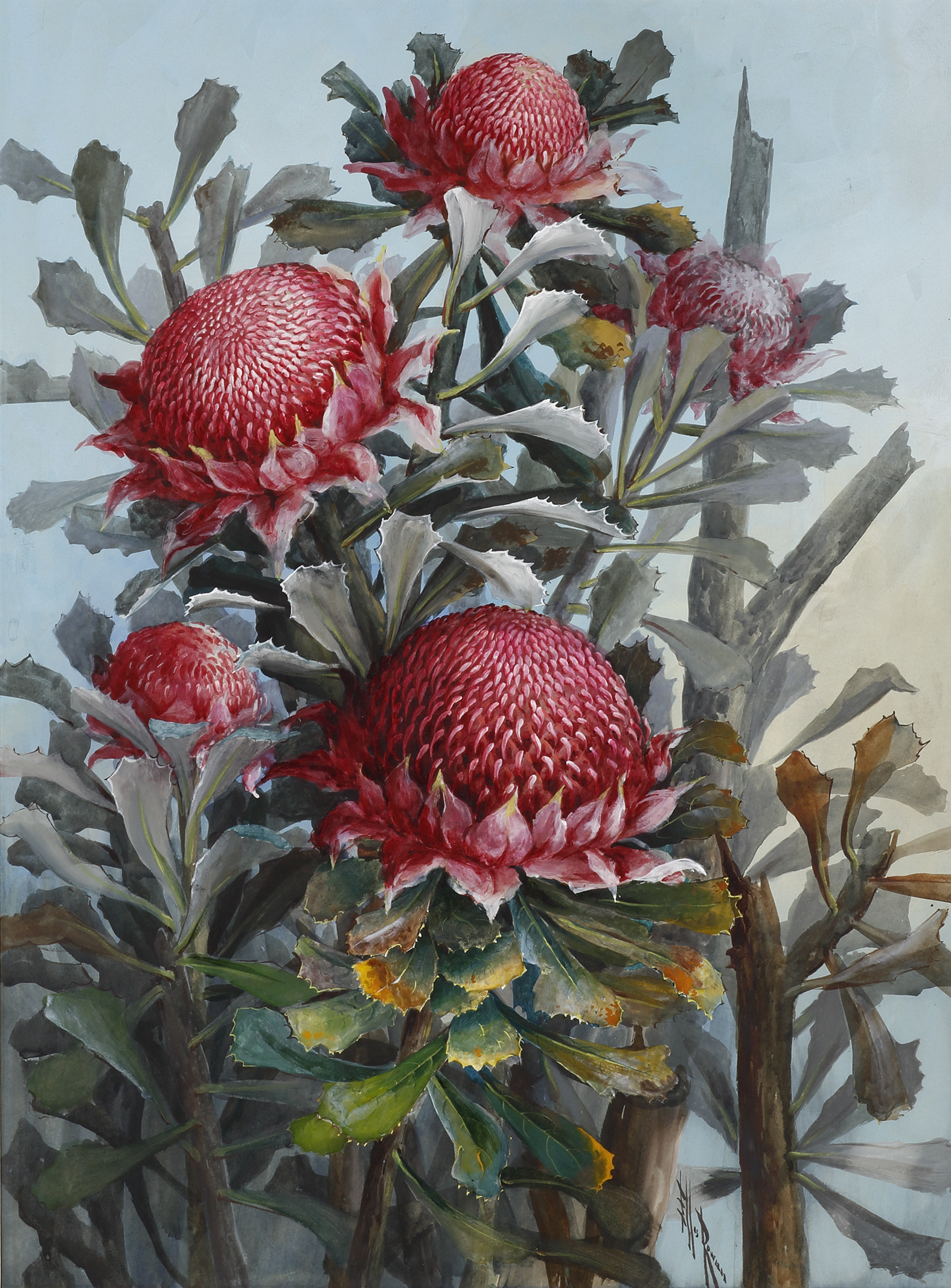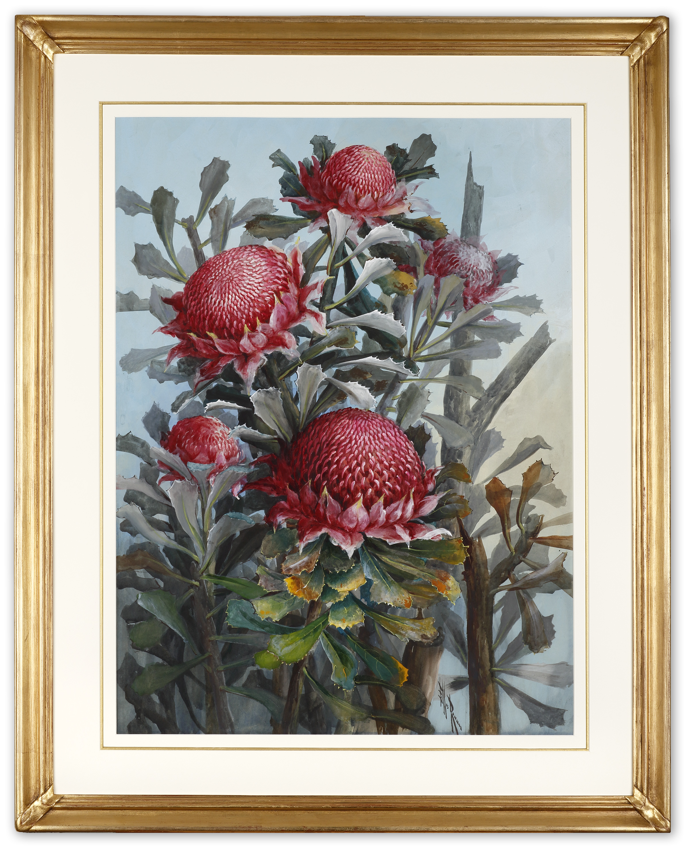 Spectacular very large, original watercolour and gouache painting of waratahs by Marian Ellis Rowan, one of Australia’s most famous female botanical artists, signed lower right. This magnifecent flower is the state emblem of New South Wales.