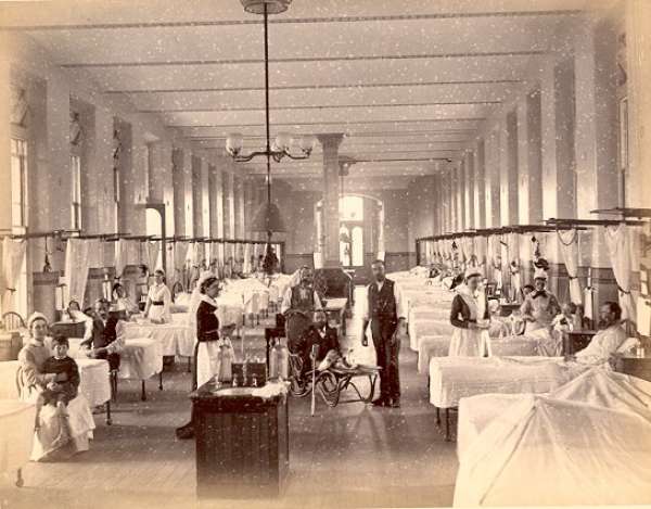 Scarce colonial image of the interior of a hospital ward.