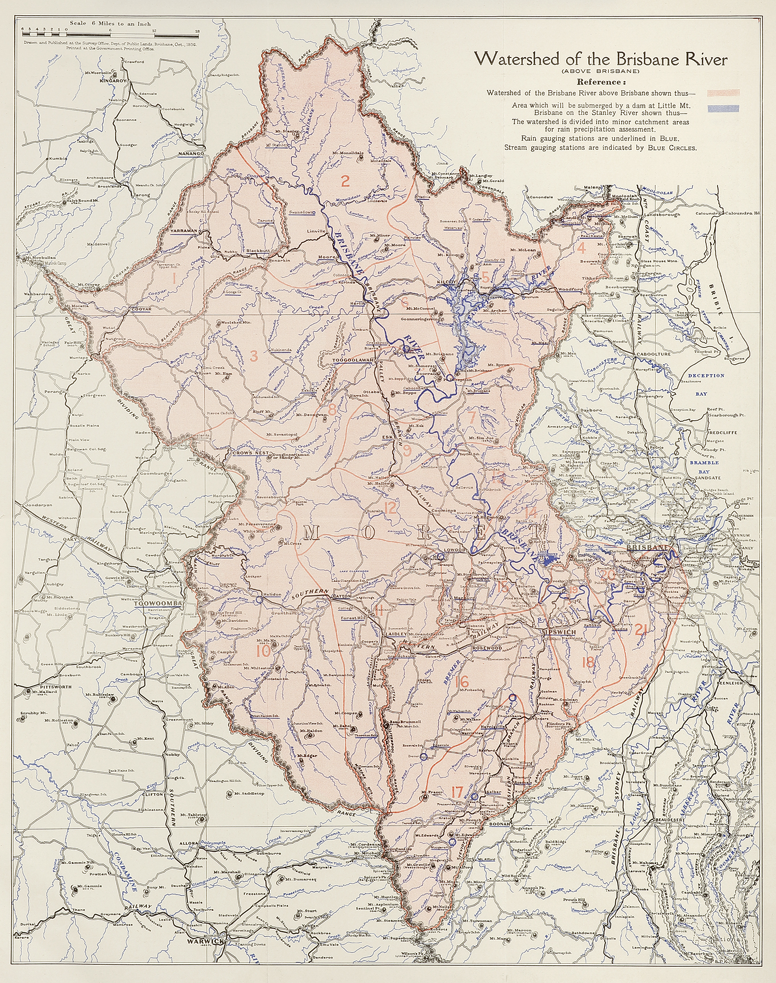 Detailed c.20th map showing the watershed around Brisbane in 1936.
