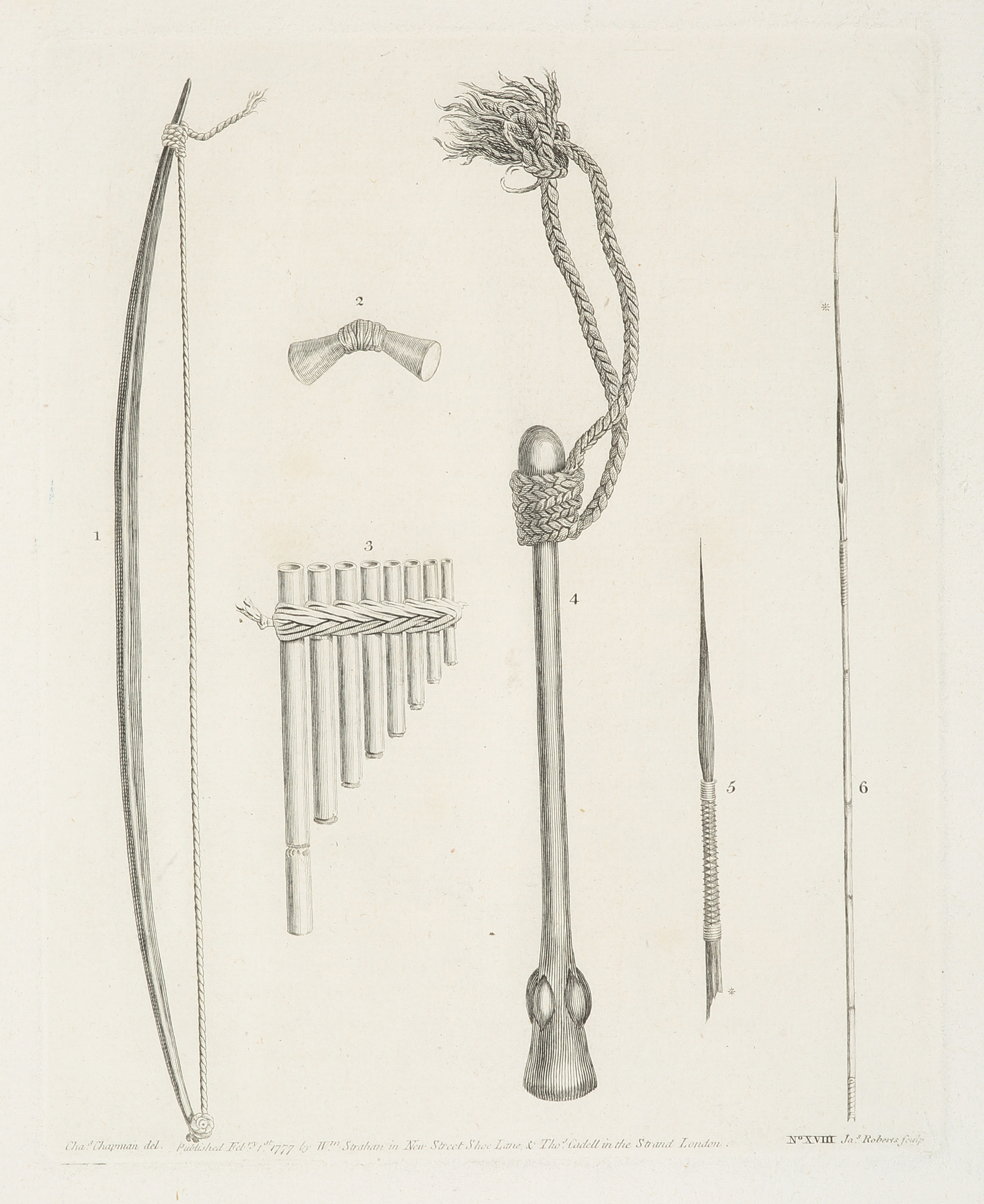 Rare c.18th engraving from the official British Admiralty sanctioned edition from the accounts of Cook’s second voyage published 1777 of weapons of Mallicollo and Tanna (Malekul and Tana, Vanuatu).. 1. A Bow 2. Stones Worn in the nose 3. Musical … Read Full Description
