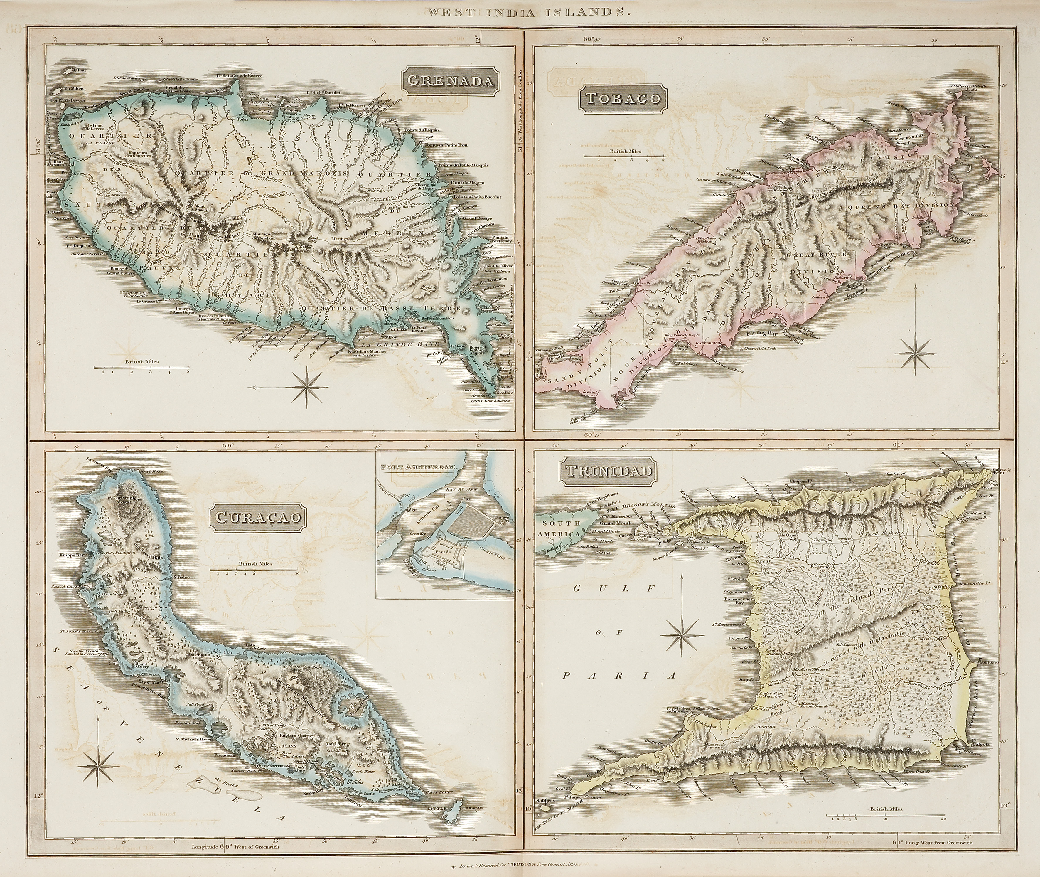 Early issue of Thomsons map of the West Indian islands of Grenada, Tobago, Trinidad and Curacao with inset map of Fort Amsterdam.
