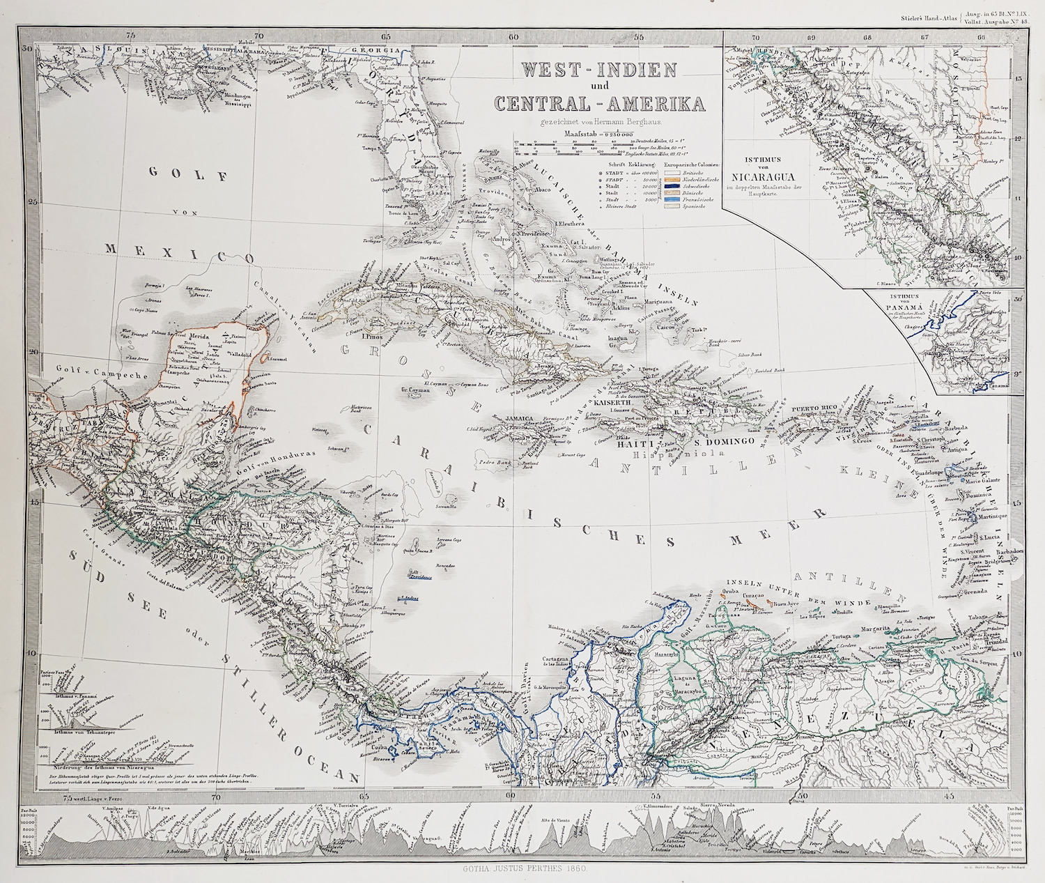 Very detailed German c.19th map of the West Indies with a inset of Nicaragua and Panama, from the 3rd edition of Stielers Handatlas.