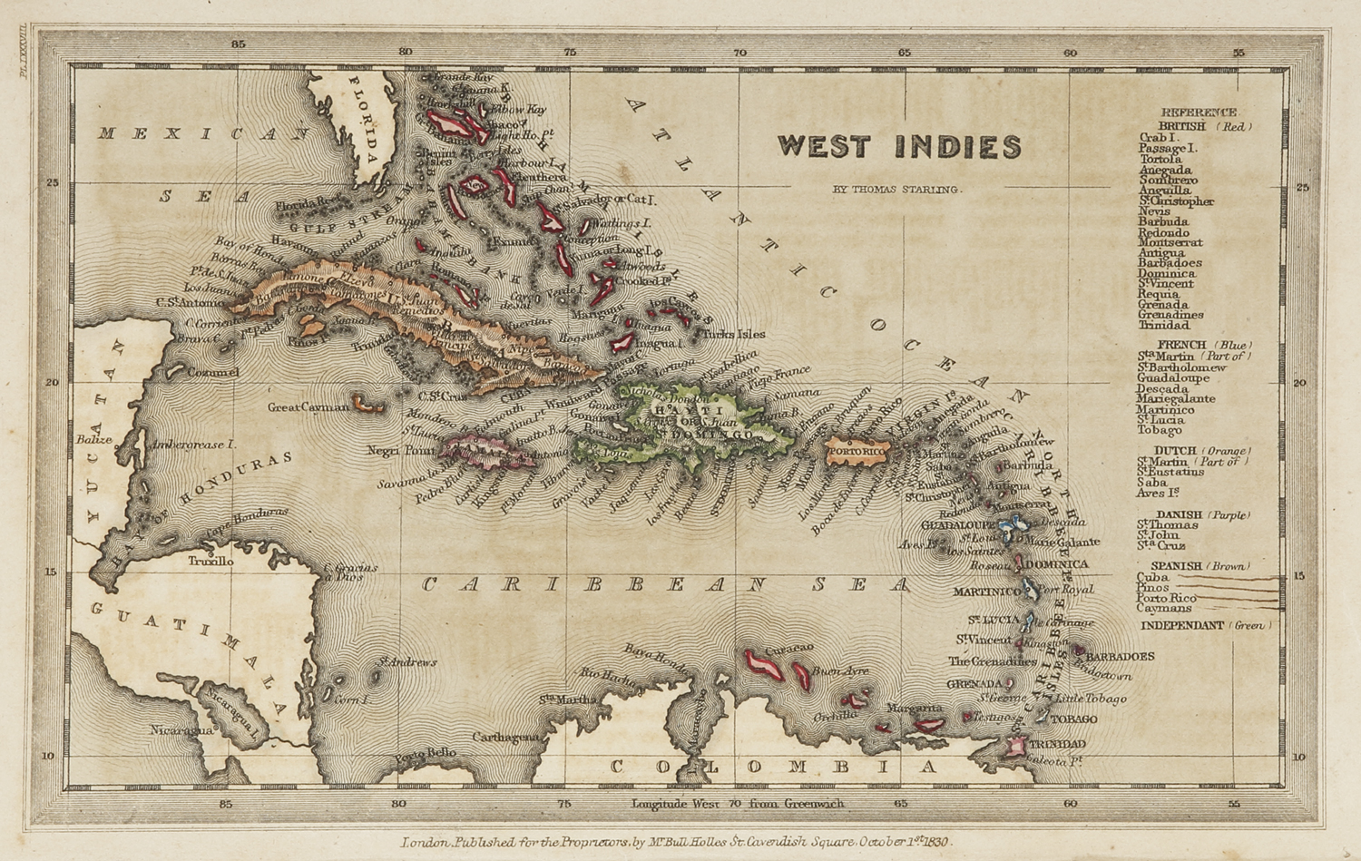 Finely engraved early c.19th miniature map of the West Indies by Thomas Starling (1796-1850) with a key on the right.