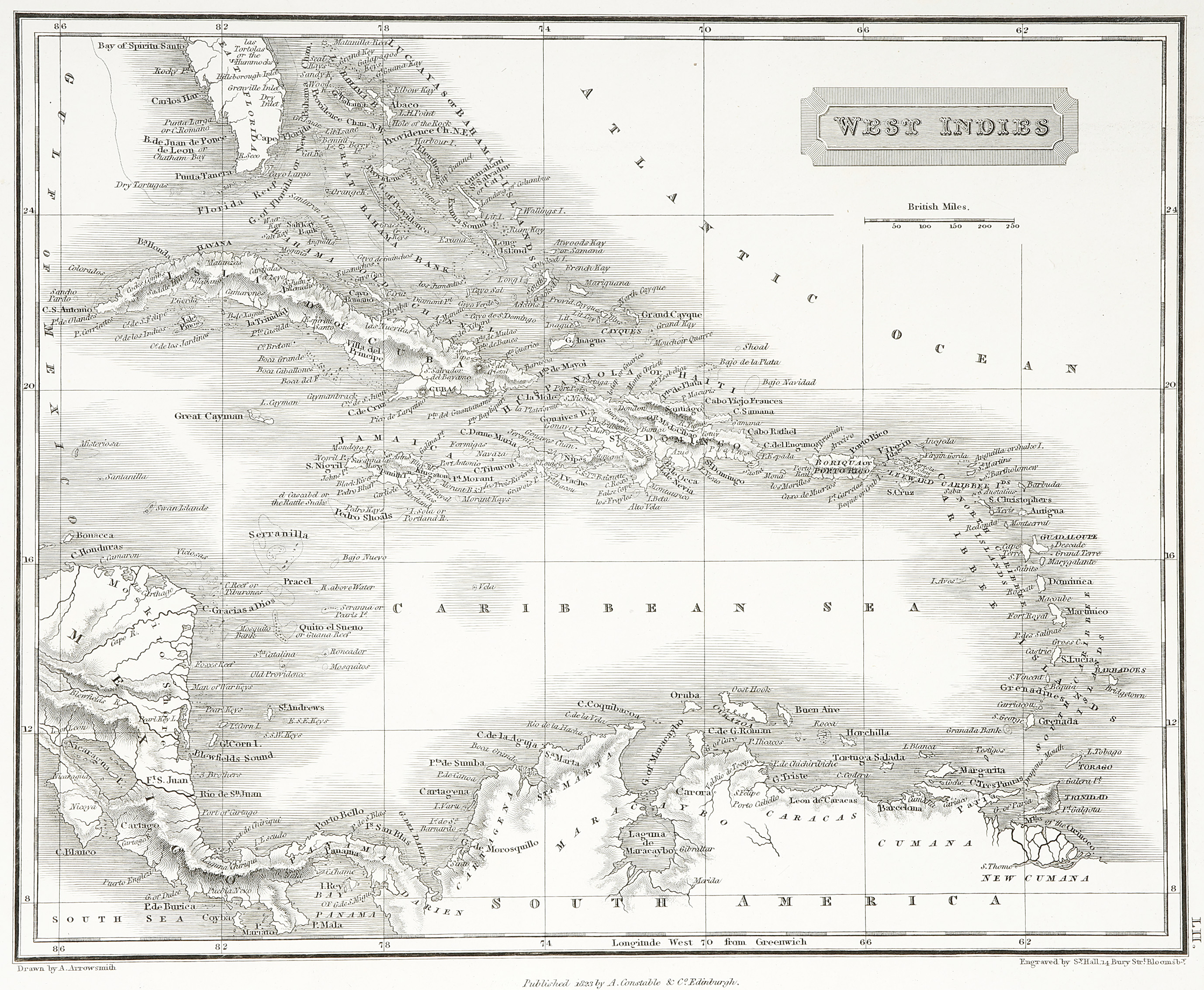 Detailed early C19th map of West Indies, by Aaron Arrowsmith, from the greatest English mapmaker of the late C18th.