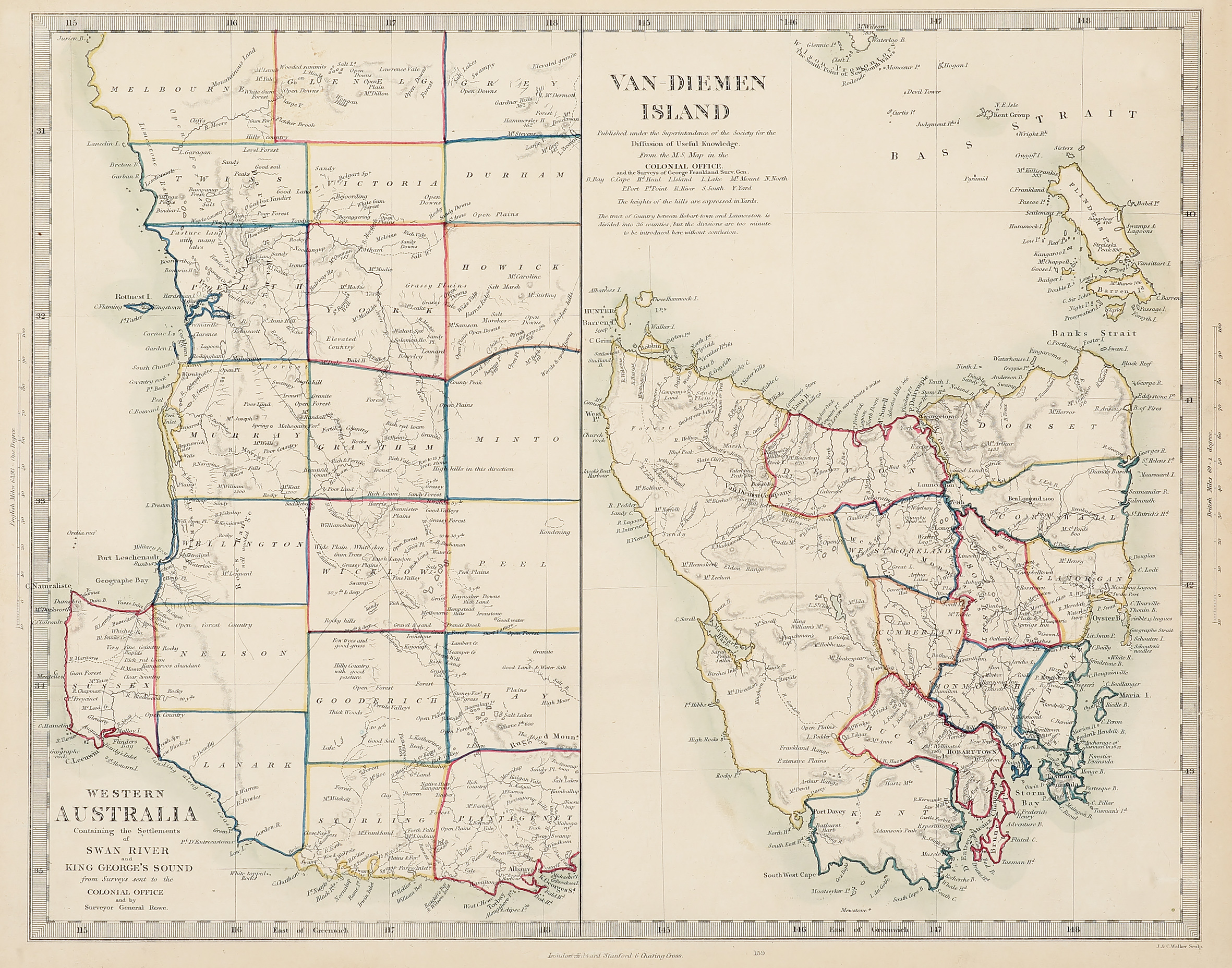 This map was originally issued in 1833, this is the updated edition which now shows the increase in the number of counties in Western Australia from 10 to 22. Van Diemens Land now is divided into 12 counties where previously there were none shown. This edition is identified by the publisher shown in the publication line at bottom, “Edward Stanford 6 Charing Cross.”