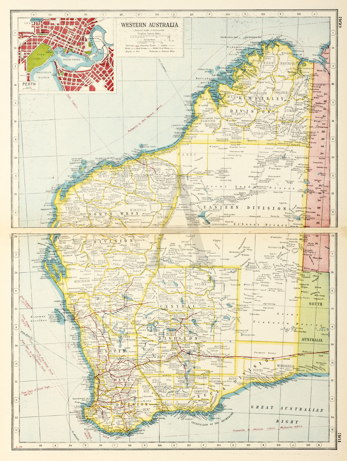 Very detailed map of Western Australia with inset of Perth, showing stock routes and mining areas.
