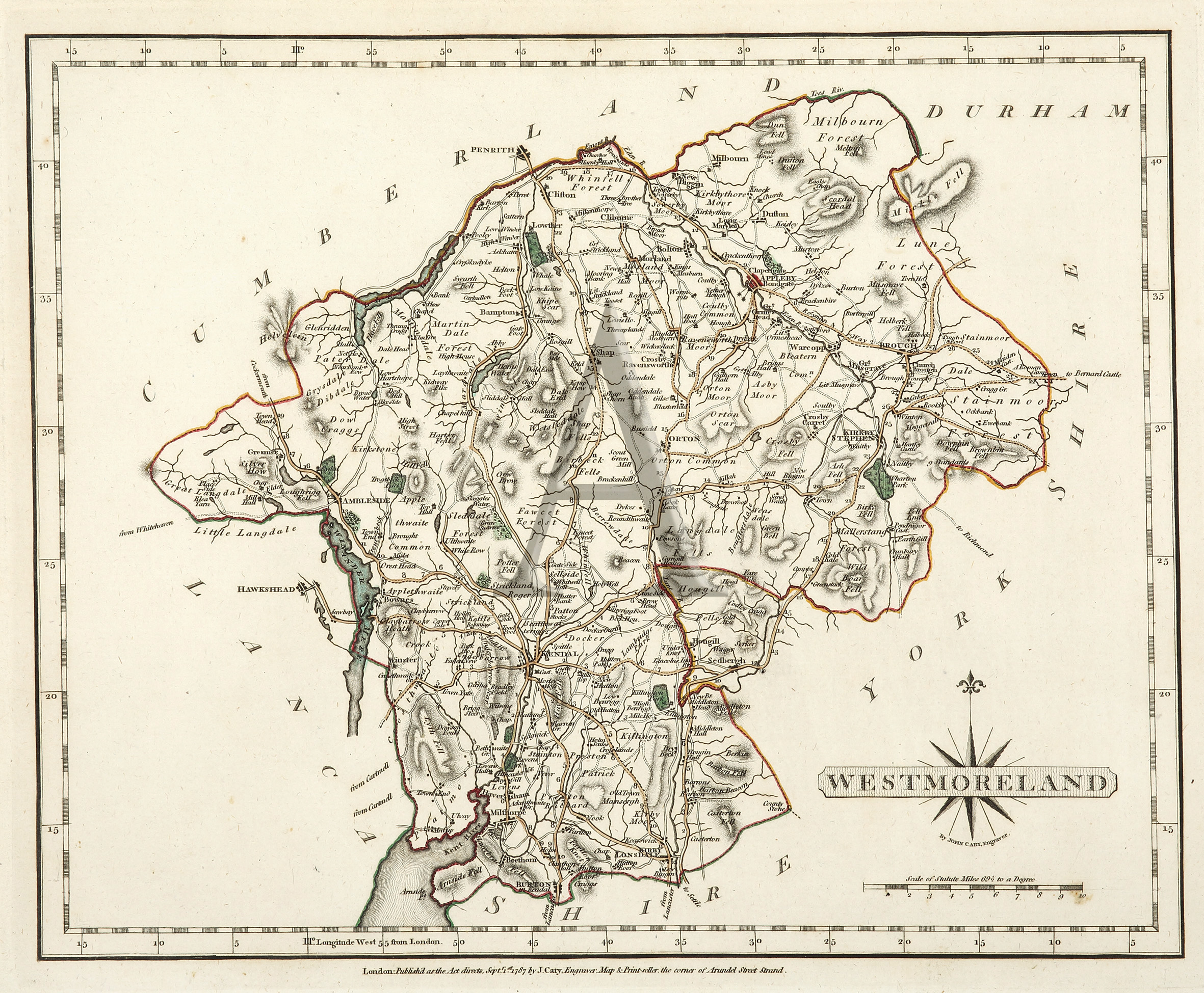 The map title is set on a compass rose, with Cary’s name and a scale of ‘British Statue Miles‘ below. Roads, towns and forests are marked. The map is accompanied with a page of descriptive text providing information on distances between towns, eminent families, rivers and the type of industries and farming.