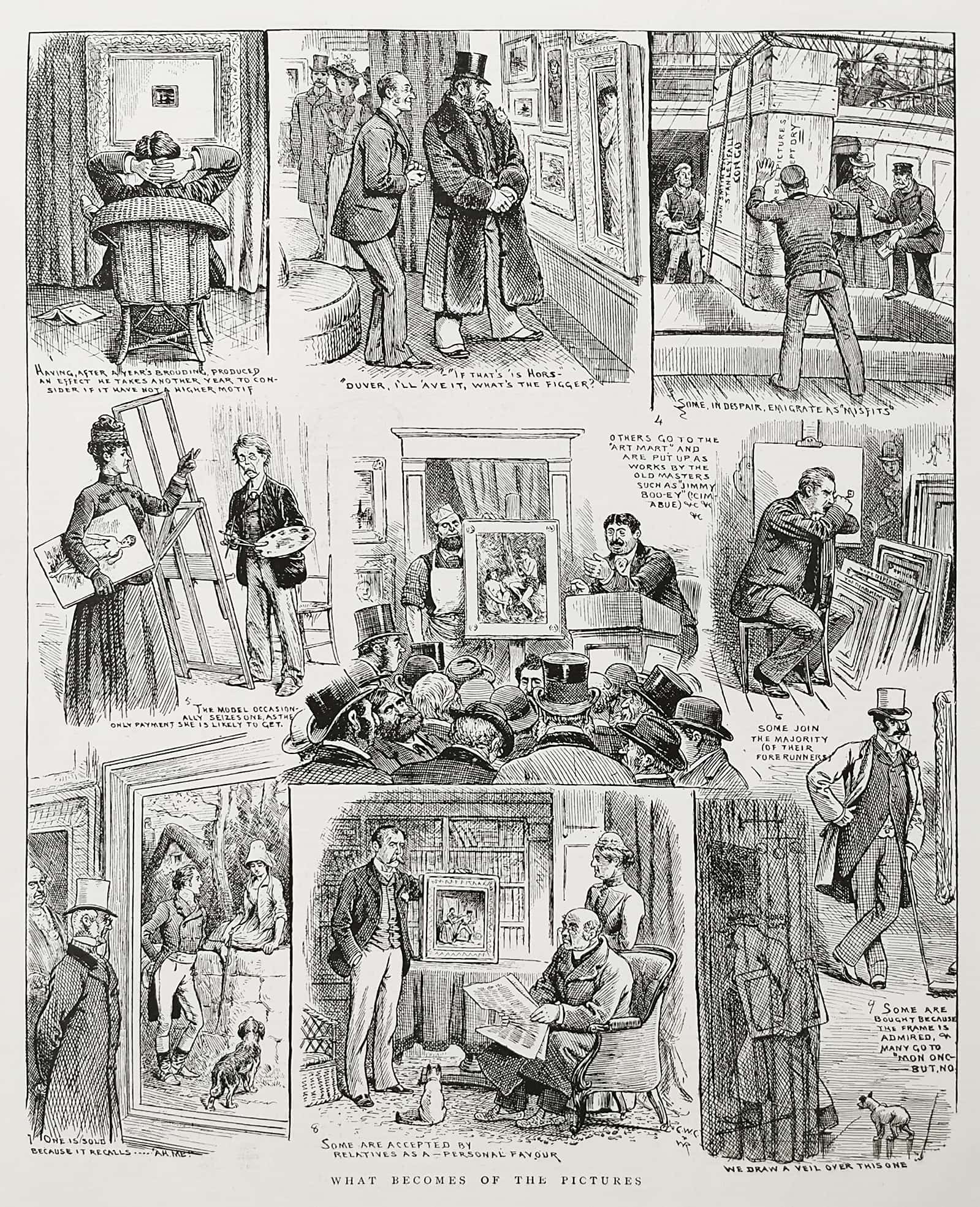 Engraving of a a story telling what happens with a painting.