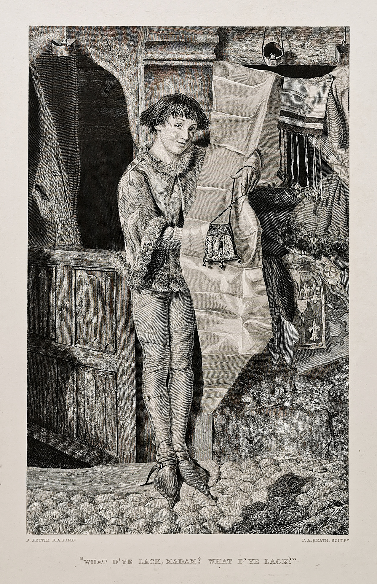 Large C19th engraving of a fabric seller. From The New Gallery of British Art.