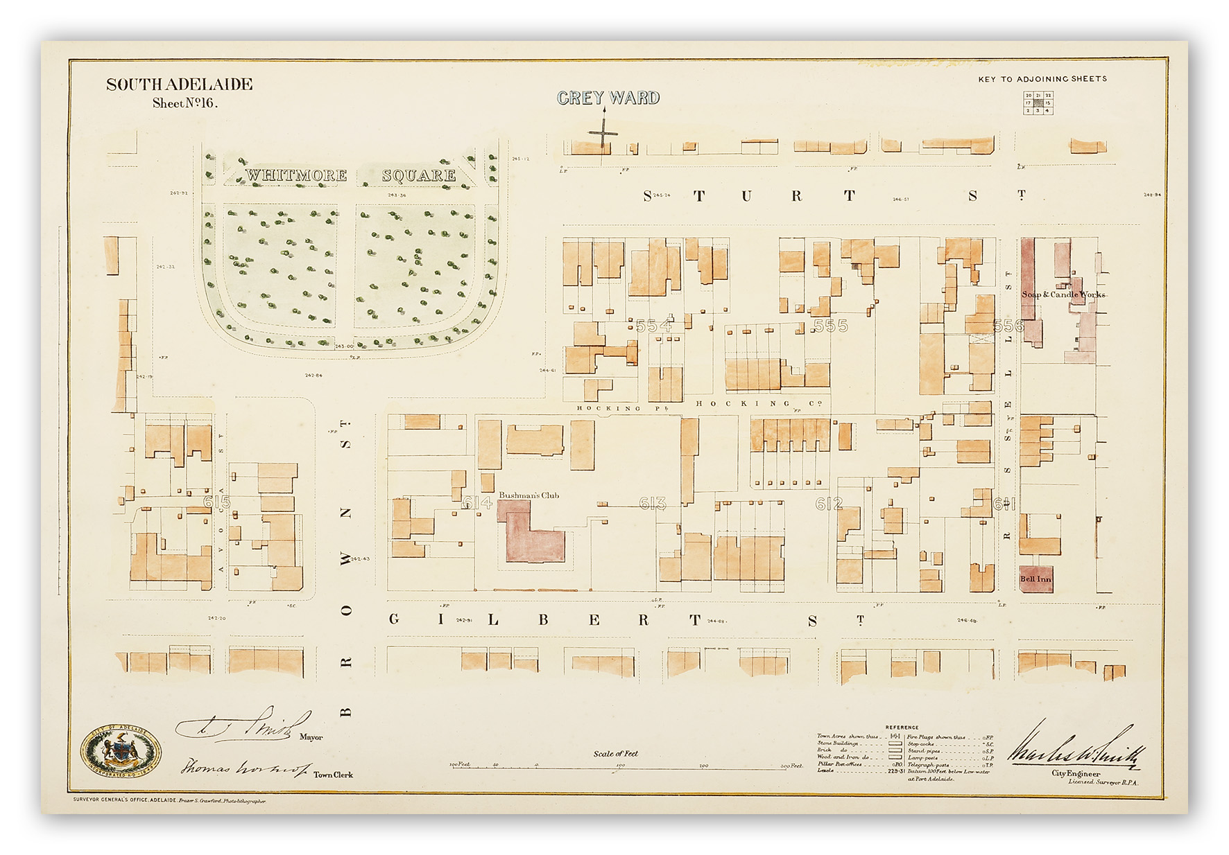 Very detailed plan of Adelaide, from Whitmore Square and extending from Sturt Street to Gilbert Street by Charles William Smith. Morphett Street is named Brown Street.