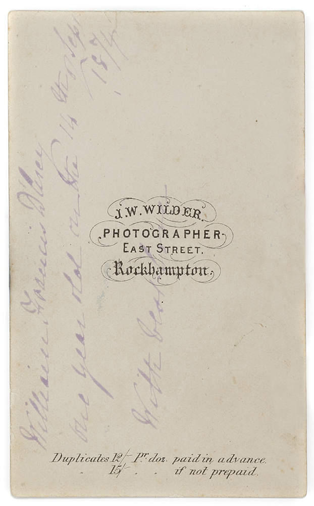 Carte de visite of William Francis D’Arcy taken by Joseph Warrin Wilder (1854-1900) taken at his premises at East Street, Rockhampton which he was at between 1872-1882. Inscribed and dated on verso “one year old on the 14th Sept 1874 … Read Full Description
