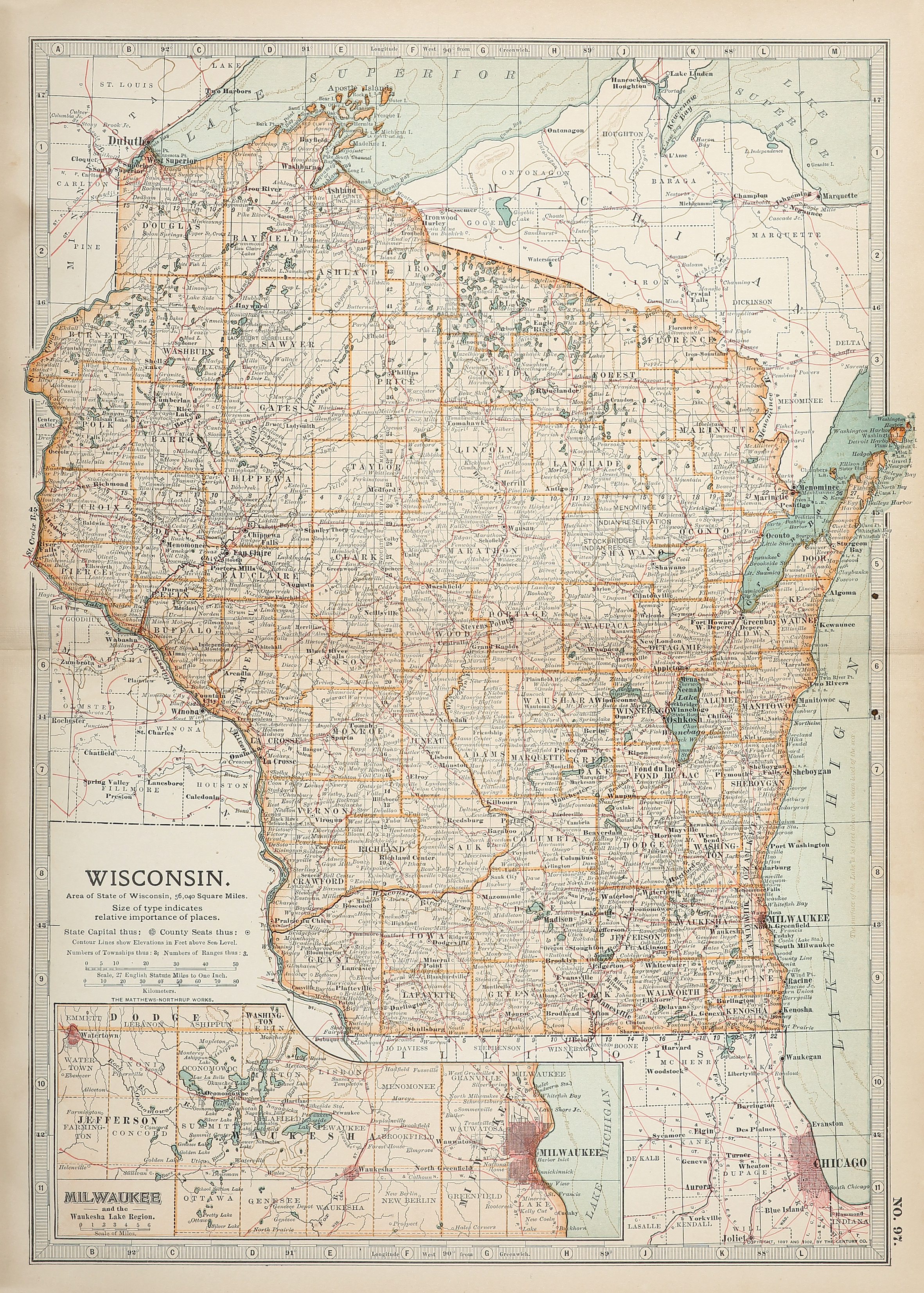 Detailed early colour printed engraved c.20th map of Wisconsin with an inset of Milwaukee. Collections: Library of Congress: tmp82010366 National Library Australia: Bib ID 2243430 National Library Scotland: E18 State Library New South Wales: Record Identifier 74VMbm46b8Xg State Library Victoria: … Read Full Description