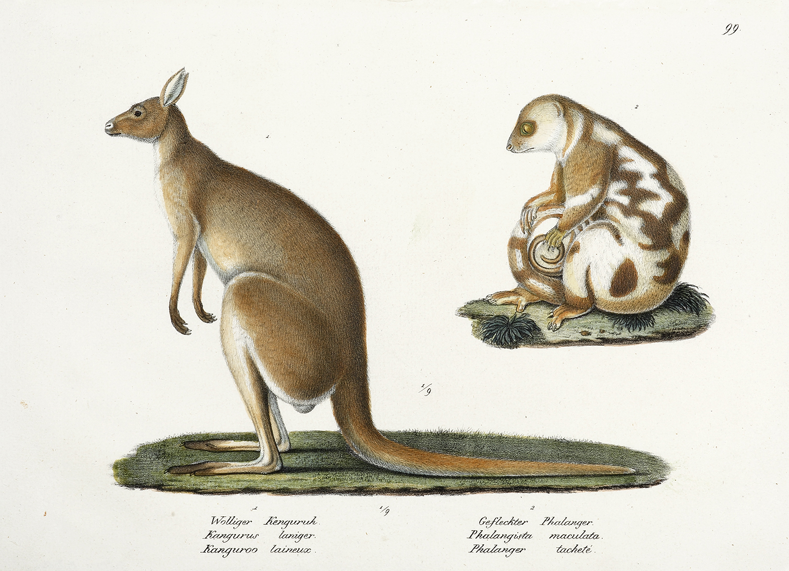 Wolliger Kenguruh, Kangurus langiger, Kanguroo laineux / Gefleckter Phalanger, Phalaniste maculata, Phalanger tachete - Antique Print from 1824
