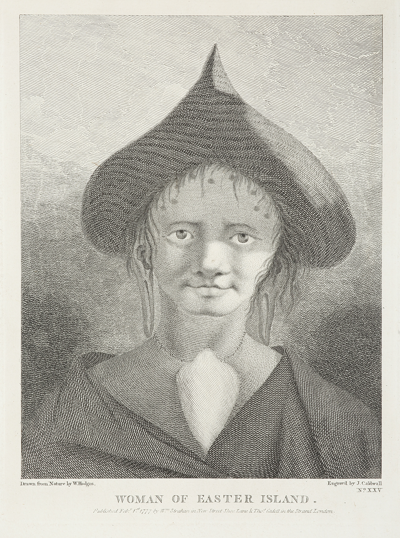 Rare c.18th engraving of a woman from Easter Island, during Cook’s visit to the island 8 October 1773 to 16 March 1774, from the official British Admiralty sanctioned edition of the accounts of Cook’s second voyage.
