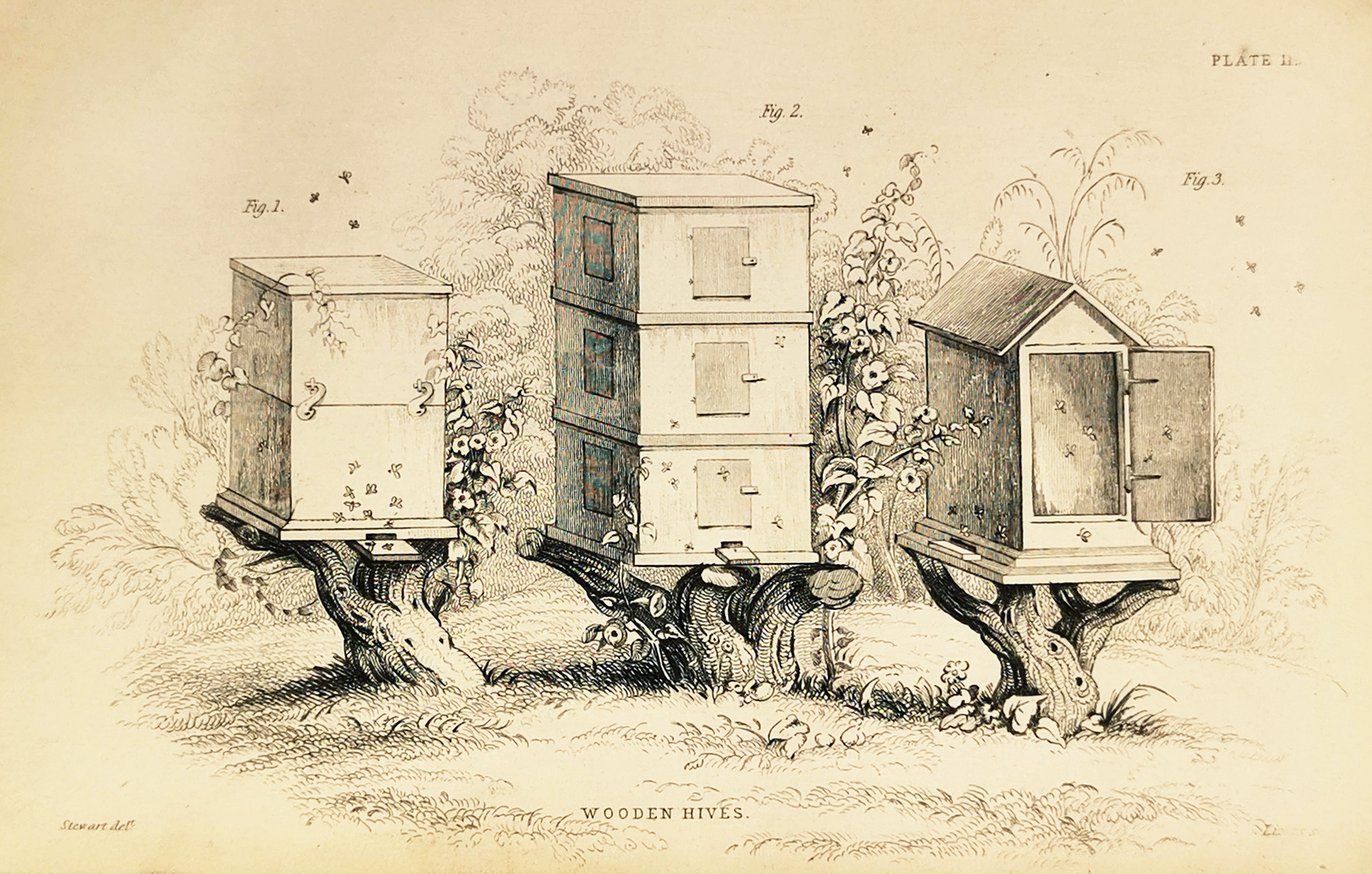 Wooden Hives - Antique Print from 1854