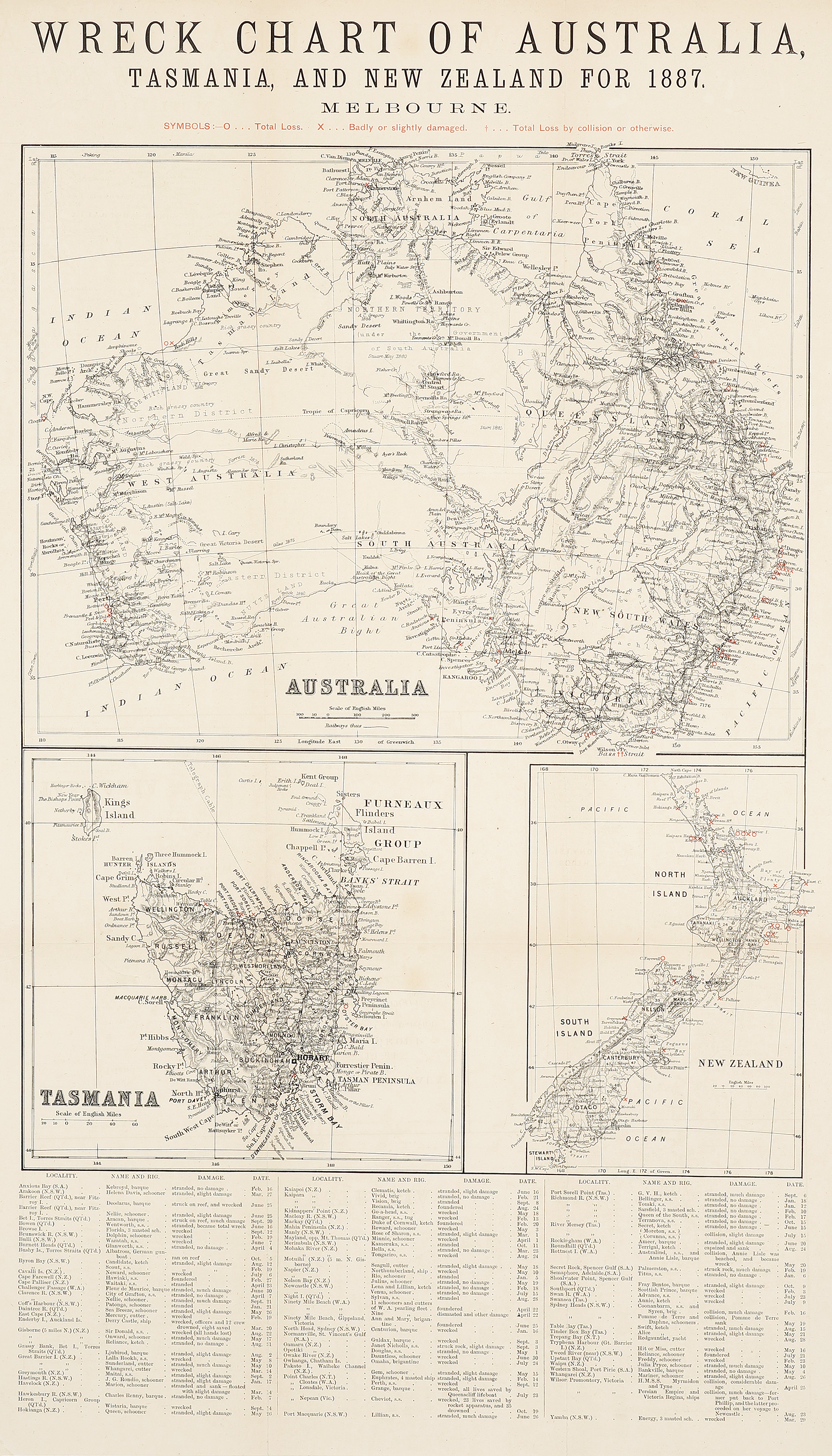 Rare, c.19th detailed chart of ship wrecks in Australian and New Zealand waters for 1887, marked in red. The map comprised a large map of Australia and two smaller insets of maps of Tasmania and New Zealand.