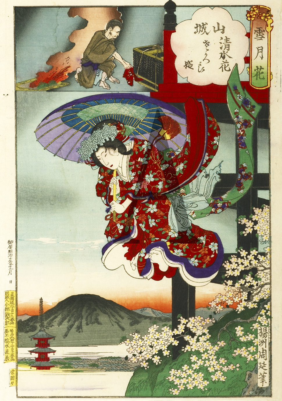The story of Princess Sakura who fell in love with the Buddhist monk Seigen of the Kimomizu temple in Kyoto. He believes she is the reincarnation of a young acolyte, he had loved many years before Seigen and the girl had vowed a double suicide by leaping off the verandah at Kimomizu, but Seigen did not follow through. The Princess is seen jumping off the balcony into the valley below in spring with the cherry in blossom. Inset: Seigen burning the belongings of his beloved. Series Snow, Moon, Flowers: December 1884