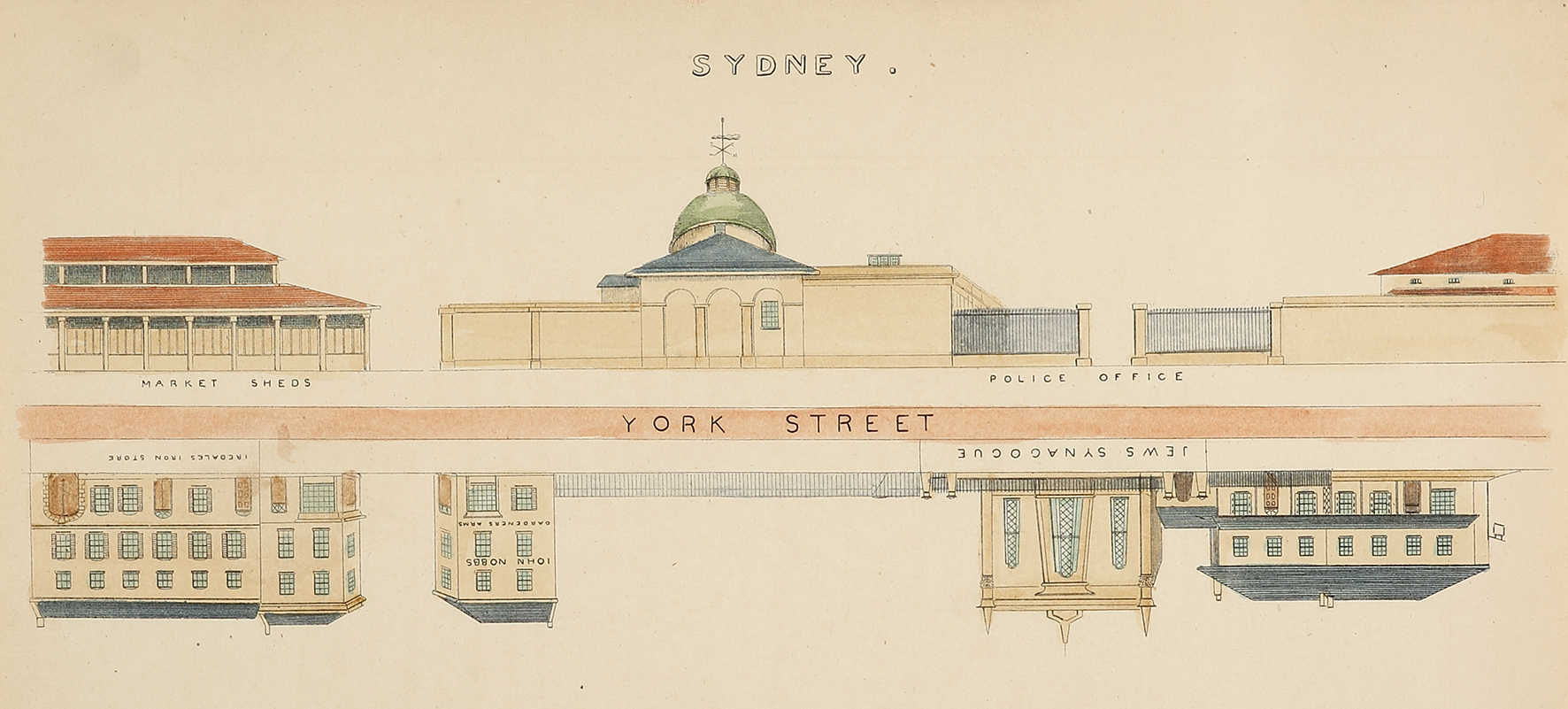 Scarce c.19th engraving of York Street with the Market Sheds and Police Office now the site of the Queen Victoria Building. At bottom from left, “Jews Synagogue, John Nobbs Gardeners Arms, Iredales Iron Store.