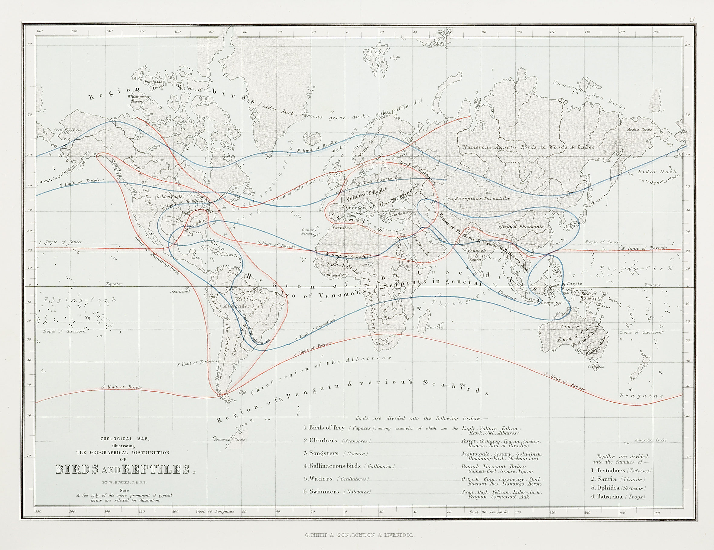 Interesting zoological map, illustrating the geographical distribution of birds and reptiles. From Philips’ Atlas of Physical Geography.